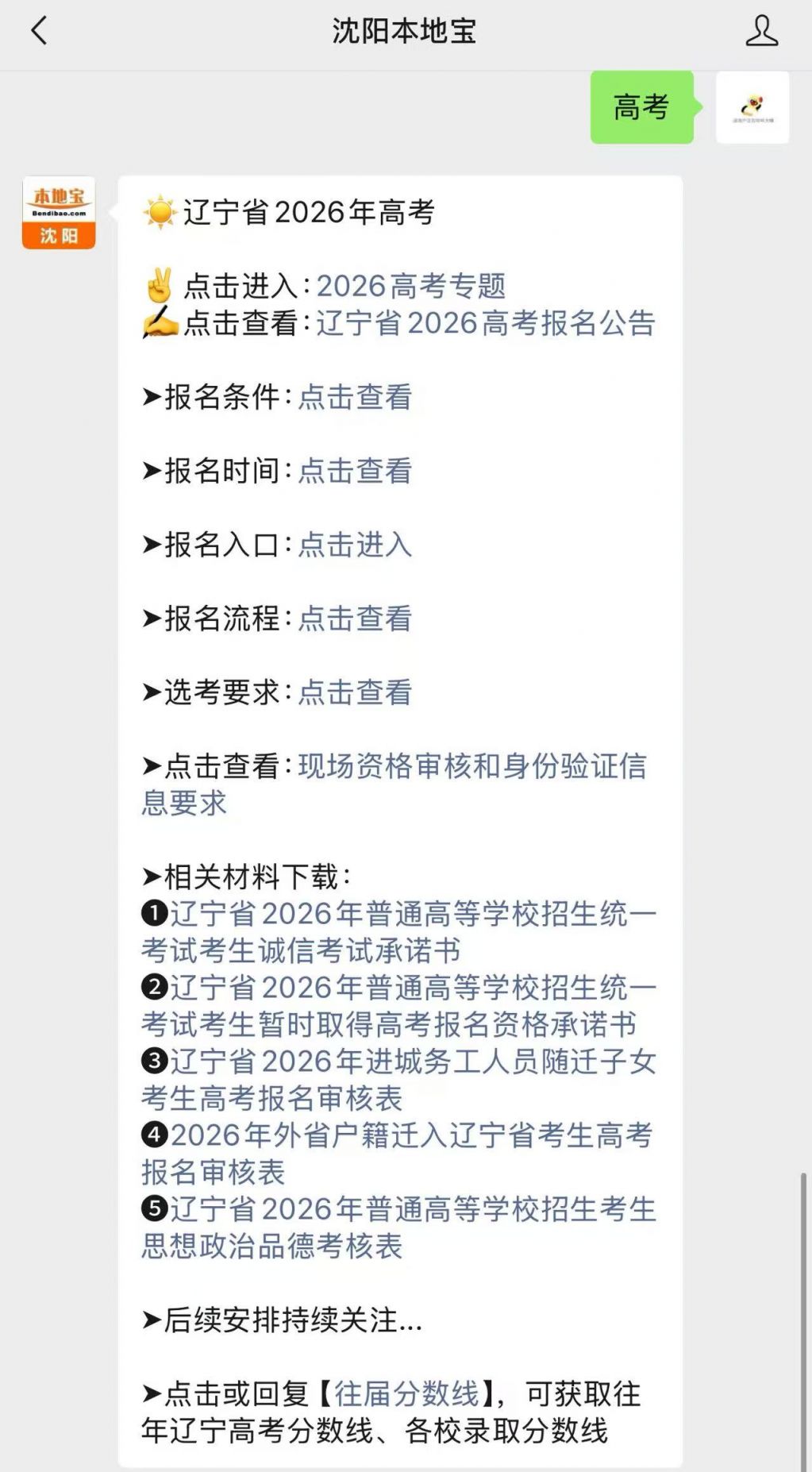 温馨提示:微信搜索并关注公众号【沈阳本地宝】,在对话页面输入并发送【高考】,可以获取辽宁2026年高考报名条件、报名时间安排、报名入口及流程、选考要求、现场资格审核材料、相关材料下载入口。