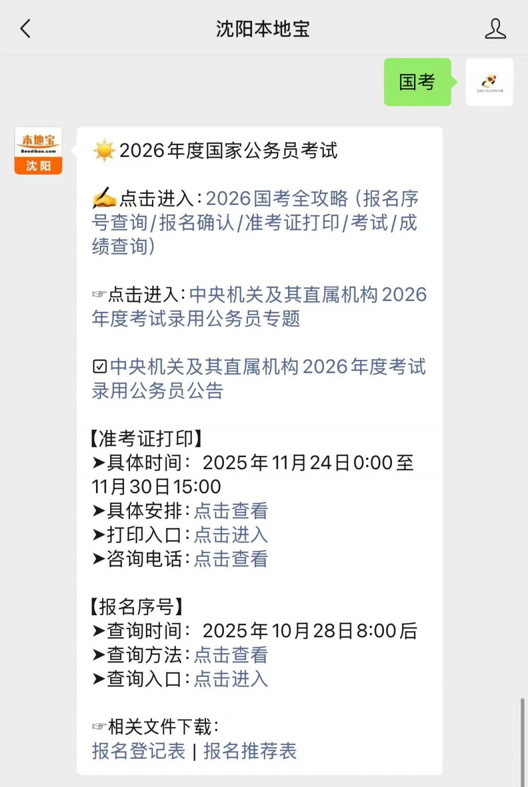 温馨提示:微信搜索并关注公众号【沈阳本地宝】,在对话页面输入并发送【国考】,可以获取2026国考准考证下载时间/入口/流程、报名序号查询安排、专题入口、时间表、考试安排以及往年数据。